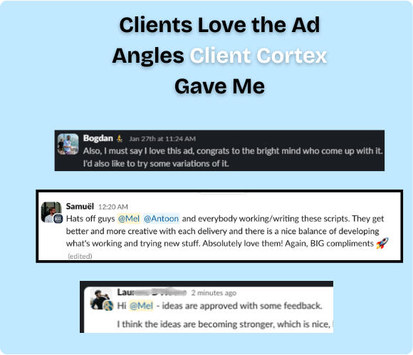 Together we launched several 7-figure funnels in 9 months (one did $66k profit in 10 days).As a Chief Creative Strategist, my ad creatives have hit 10%+ CTR and 3+ ROAS.Point is: people hire me to come up with big ideas that make them money.But therein lies the problem: You can't hire me full-time anymore.So here's the solution:Client Cortex lets you install my brain into your agency.Every framework I use.